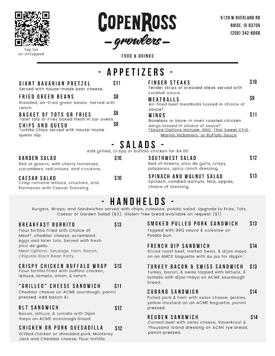 Welcome to CopenRoss Crafthouse & Grill, a vibrant dining destination nestled in Boise, Idaho. Their menu, inspired by global flavors and local ingredients, caters to a diverse palate. Highlights include the renowned Cubano sandwich, praised for its rich flavors and paired beautifully with house-made potato salad. For those seeking unique beverages, CopenRoss boasts an impressive selection of 60 craft beer taps, including creative options like Jalapeno IPA and refreshing Pineapple Cider.